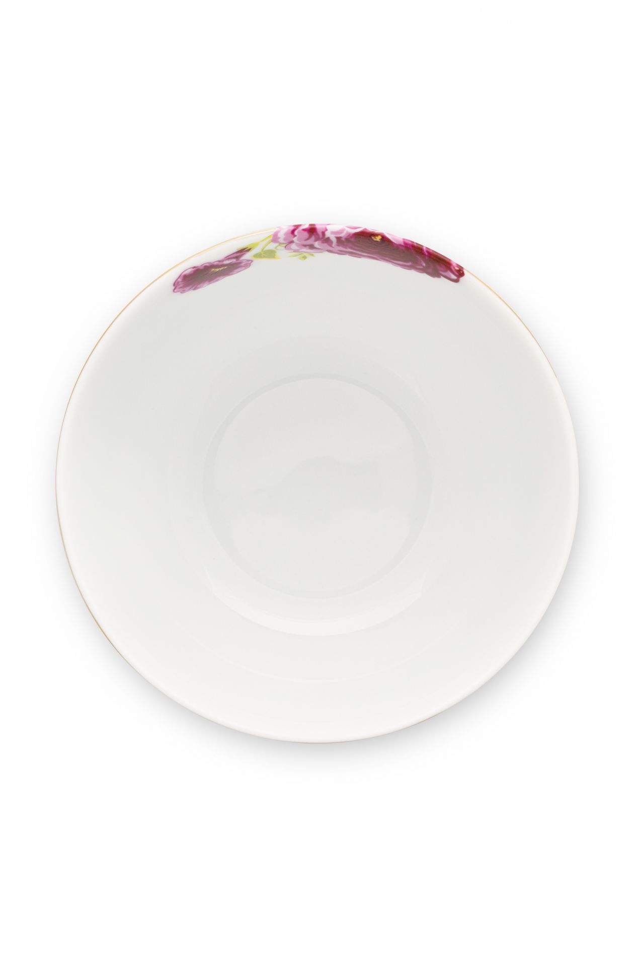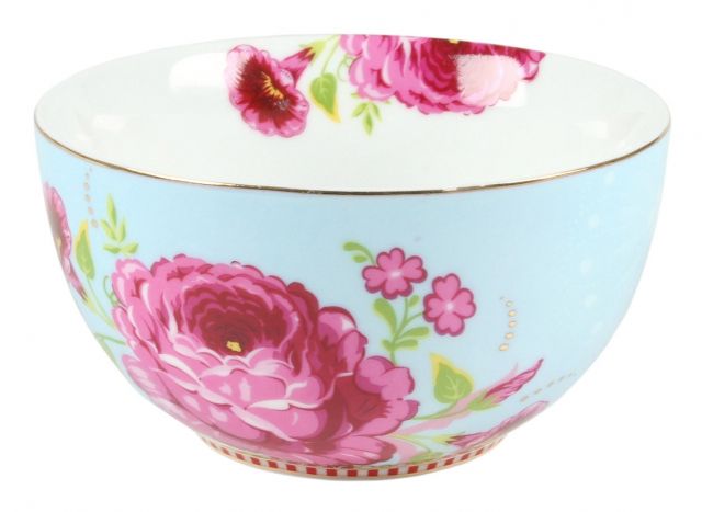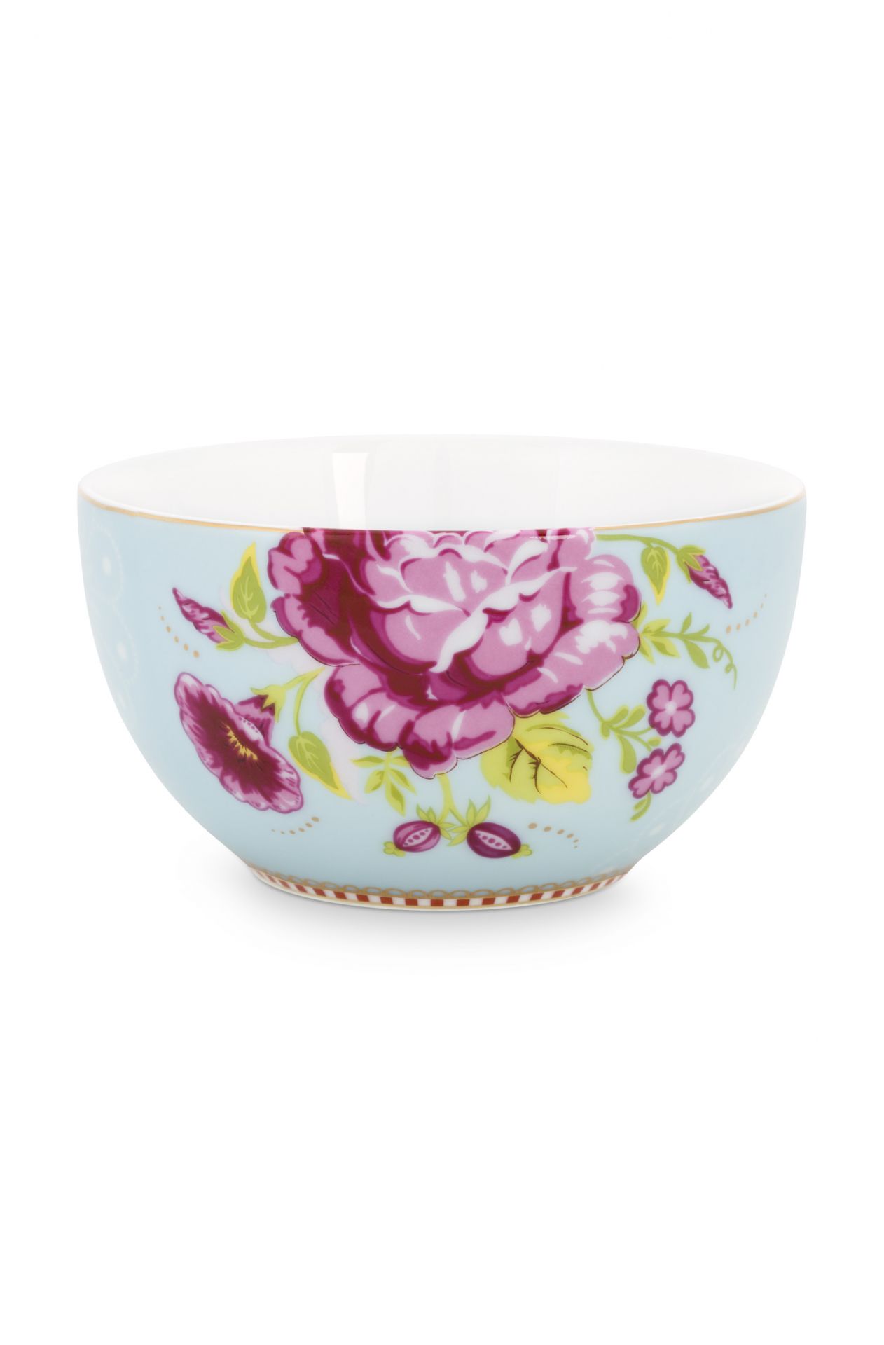 Die Schale ist mit dem Early Bird Design verziert: ein Vogel und ein detaillierter Blumendruck, der sich auf der Innenseite fortsetzt. Abgeschlossen wird sie mit dem bekannten rot-weiß gestreiften Pip-Rand mit goldenen Details.