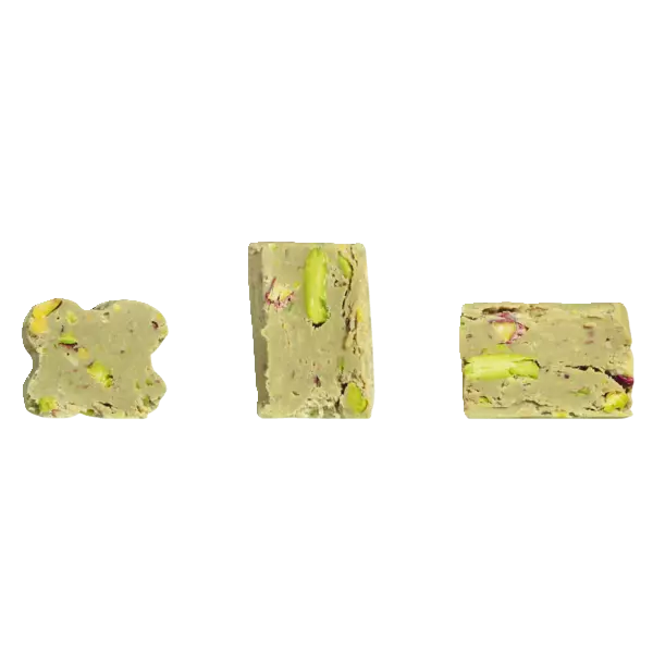 weiße Schokolade 62%, (Zucker, Vollmilchpulver, Kakaobutter, Emulgator: Sojalecithin, natürliches Vanillearoma), gehackte u. gemahlene Pistazienkerne 32%, Zucker, kann Spuren von Schalenfrüchten enthalten